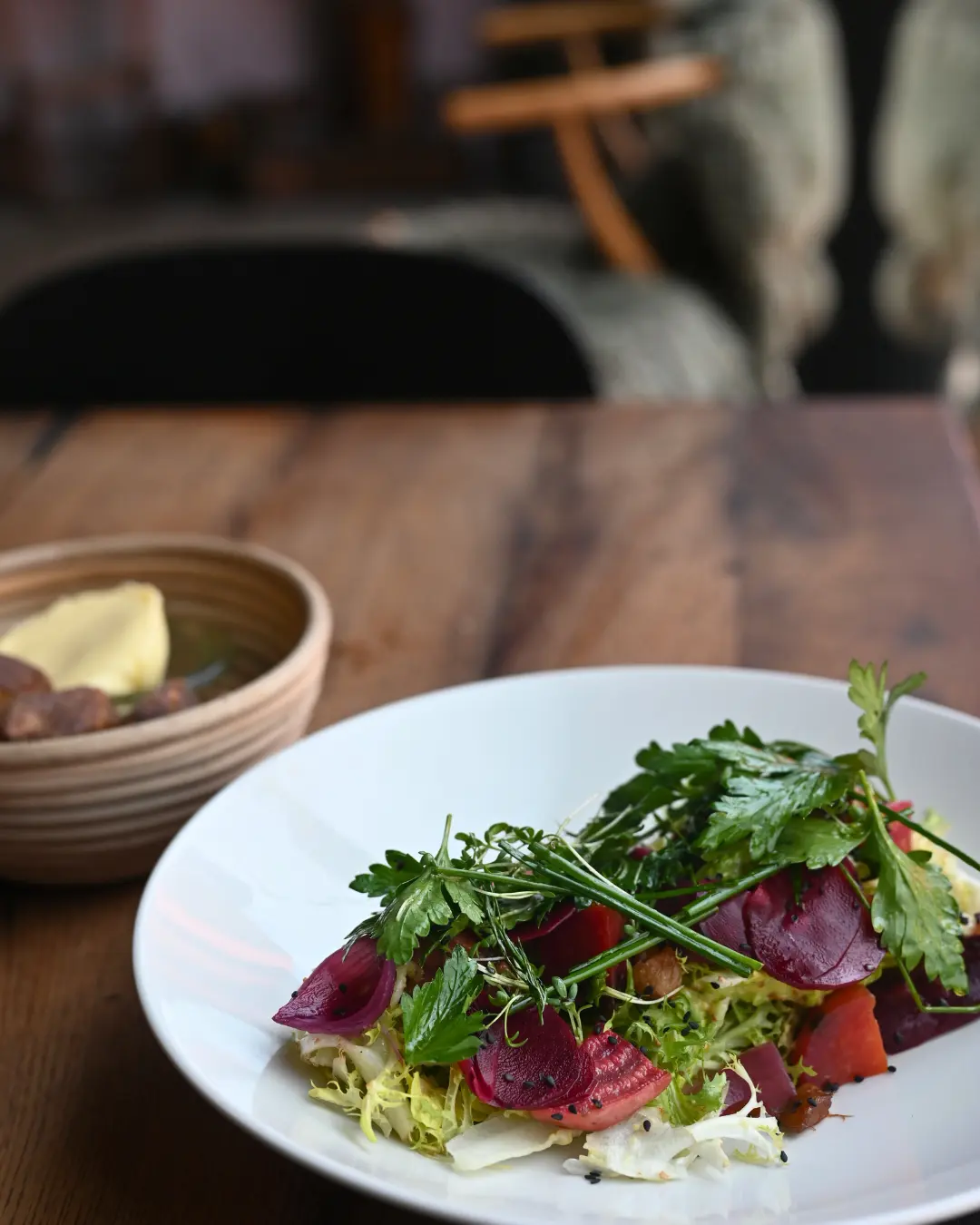 Marineret julesalat, brunet selleripure med hvidløg, syltet selleri og krabbebisque